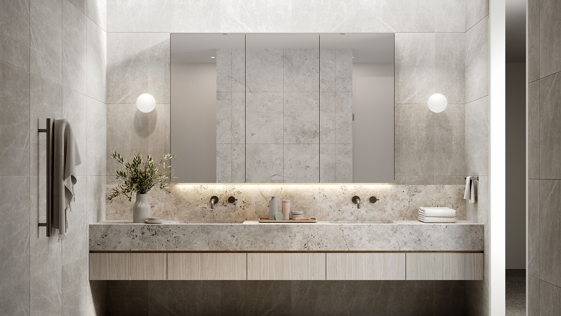 Bathrooms and ensuites feature mood lighting along with elegant wall-mounted tapware creating a calming yet visually dynamic. Large areas of tilework wrap the space in a tactile finish, with huge skylights providing captivating natural light. Stone surfaces and brushed nickel finishes provide a minimal and sophisticated design narrative, which is further enhanced by inbuilt niches and fluted glass screening.Â